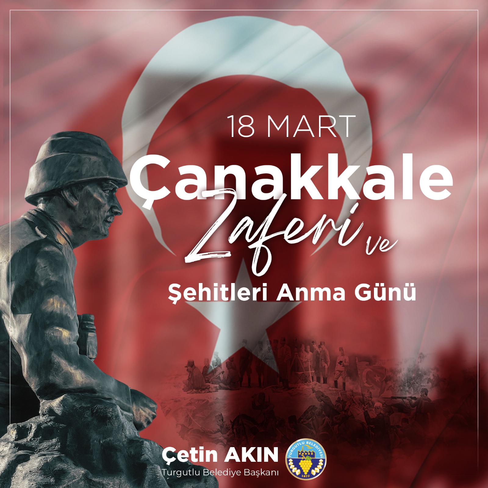 Turgutlu Belediye Başkanı Çetin Akın 18 Mart Çanakkale Zaferi ve Şehitleri Anma Günü’nün 109’uncu yıl dönümünü yayınladığı mesajla kutladı. Başkan Çetin Akın, “109 yıl önce olduğu gibi bugün ve yarın da aynı azim, inanç, kararlılıkla Gazi Mustafa Kemal Atatürk’ün izinde yürümeye; Cumhuriyetimizin tüm kazanımlarına sahip çıkmaya devam edeceğiz” dedi.Başkan Çetin Akın 18 Mart Çanakkale Zaferi ve Şehitleri Anma Günü’nü şu sözlerle kutladı:“Türk Milleti’nin bağımsızlık mücadelesinde çok önemli bir zafer olan Çanakkale Zaferi, ulusumuzun en büyük gurur ve onur günlerinden biridir. 109 yıl önce bugün "Çanakkale Geçilmez" diyen Anafartalar Komutanı Gazi Mustafa Kemal Atatürk’ün, önderliğinde vatanın bir karış toprağını vermemek için savaşan aziz Türk milleti, Çanakkale Zaferi ile milletimizin bağımsızlık mücadelesine ilham kaynağı olmuştur. Bu eşsiz zafer bağımsız ve özgür yaşama kararlılığımızı güçlü bir inançla ortaya koymuş, tüm dünyada bu milletin var oluş iradesini göstermiştir. Bizlere bağımsız bir vatan bırakmak için canını veren, atalarımızın fedakarlıkları sayesinde bugün Türkiye Cumhuriyeti Devleti olarak varlığımızı sürdürüyoruz. 109 yıl önce olduğu gibi bugün ve yarın da aynı azim, inanç, kararlılıkla Gazi Mustafa Kemal Atatürk’ün izinde yürümeye; Cumhuriyetimizin tüm kazanımlarına sahip çıkmaya devam edeceğiz.Bu duygu ve düşünceler içerisinde 18 Mart Çanakkale Zaferi ve Şehitleri Anma Günü’nün 109’uncu yıl dönümünü kutluyor, Başkomutanımız Ulu Önder Gazi Mustafa Kemal Atatürk ile silah arkadaşlarını ve vatanın bölünmez bütünlüğü için canlarını feda eden tüm şehitlerimizi ve ebediyete göç eden gazilerimizi sevgi, saygı, şükran ve rahmetle anıyorum.”