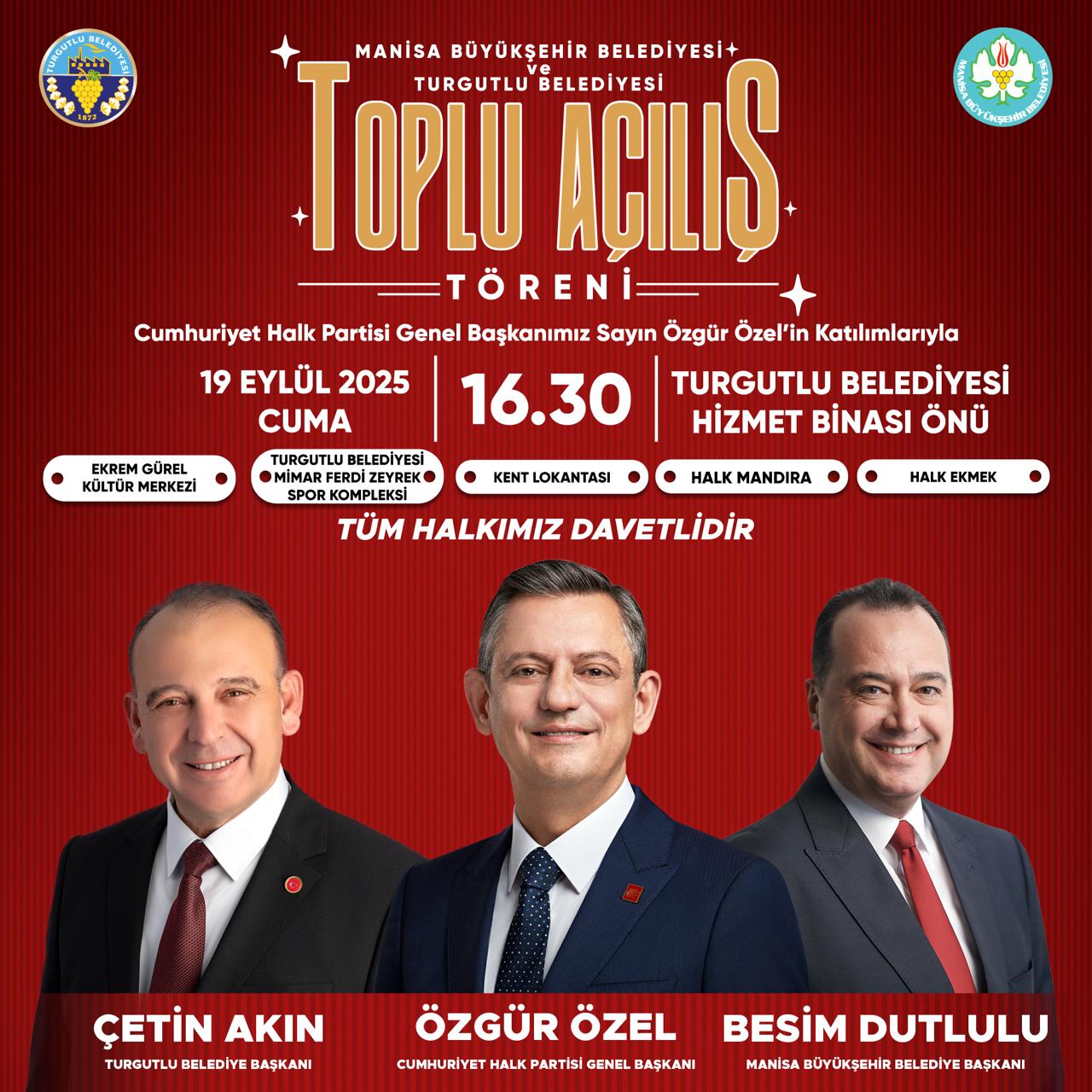Turgutlu Belediyesi, kente kazandırdığı 5 projeyi Manisa Büyükşehir Belediyesiyle düzenleyeceği ‘Toplu Açılış Töreni’ ile hizmete açacak. Cumhuriyet Halk Partisi Genel Başkanı Özgür Özel’in katılacağı tören 19 Eylül Cuma günü saat 16.30’da yapılacak.Turgutlu Belediyesi, kentin yeni eğitim, kültür ve spor yuvası olacak Mimar Ferdi Zeyrek Spor Kompleksi ve Ekrem Gürel Kültür Merkezi ile Manisa Büyükşehir Belediyesi iş birliğiyle hizmete sunacağı Kent Lokantası, Halk Mandıra ve Halk Ekmek projelerinin toplu açılışını 19 Eylül Cuma günü, Cumhuriyet Halk Partisi Genel Başkanı Özgür Özel’in katılımıyla gerçekleştirecek. Manisa Büyükşehir Belediyesi ile birlikte yapılacak ‘Toplu Açılış Töreni’ saat 16.30’da Belediye Hizmet Binası Önünde başlayacak.Turgutlu Belediye Başkanı Çetin Akın, “Genel Başkanımız Sayın Özgür Özel ile birlikte temelini attığımız spor kompleksi ve kültür merkezimizin, bunun yanında Manisa Büyükşehir Belediyemizle birlikte hizmete açacağımız Kent Lokantası, Halk Mandıra ve Halk Ekmek projelerimizin açılını yine Genel Başkanımız Özgür Özel ve Manisa Büyükşehir Belediye Başkanımız Besim Dutlulu ile gerçekleştireceğiz. Belediyemizin kendi imkan ve kaynaklarıyla aynı zamanda Büyükşehir Belediyemizin katkı ve destekleriyle Turgutlu’muza kazandırdığımız projelerimizin ‘Toplu Açılış Töreni’ne tüm hemşehrilerimi davet ediyorum” dedi.