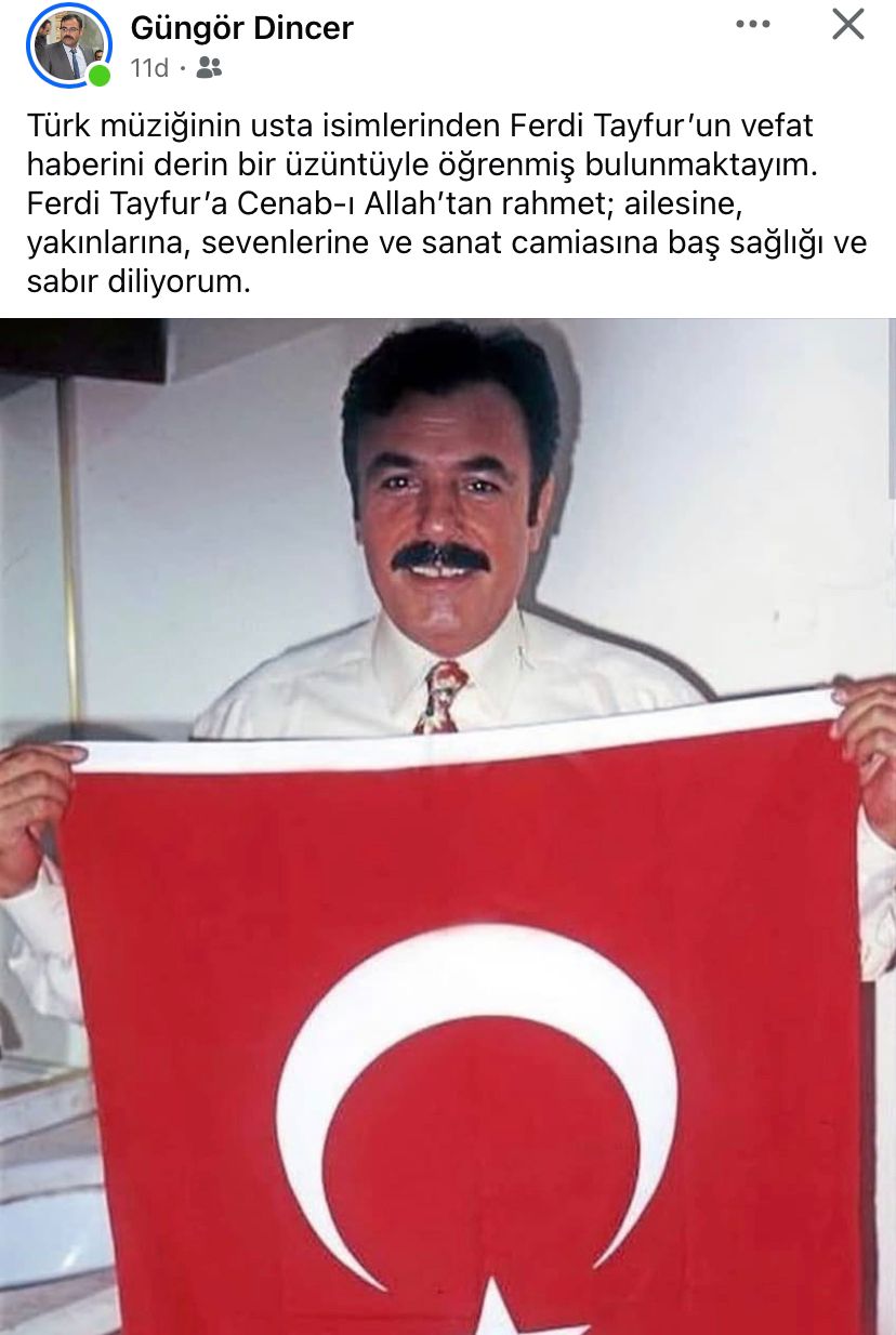 Milliyetçi Hareket Partisi 28. Dönem Manisa Milletvekili Adayı Güngör Dincer, Antalya'da hayatını kaybeden sanatçı Ferdi Tayfur için sosyal medya üzerinden başsağlığı diledi ve sanatçının müzik kariyerine vurgu yaptı.