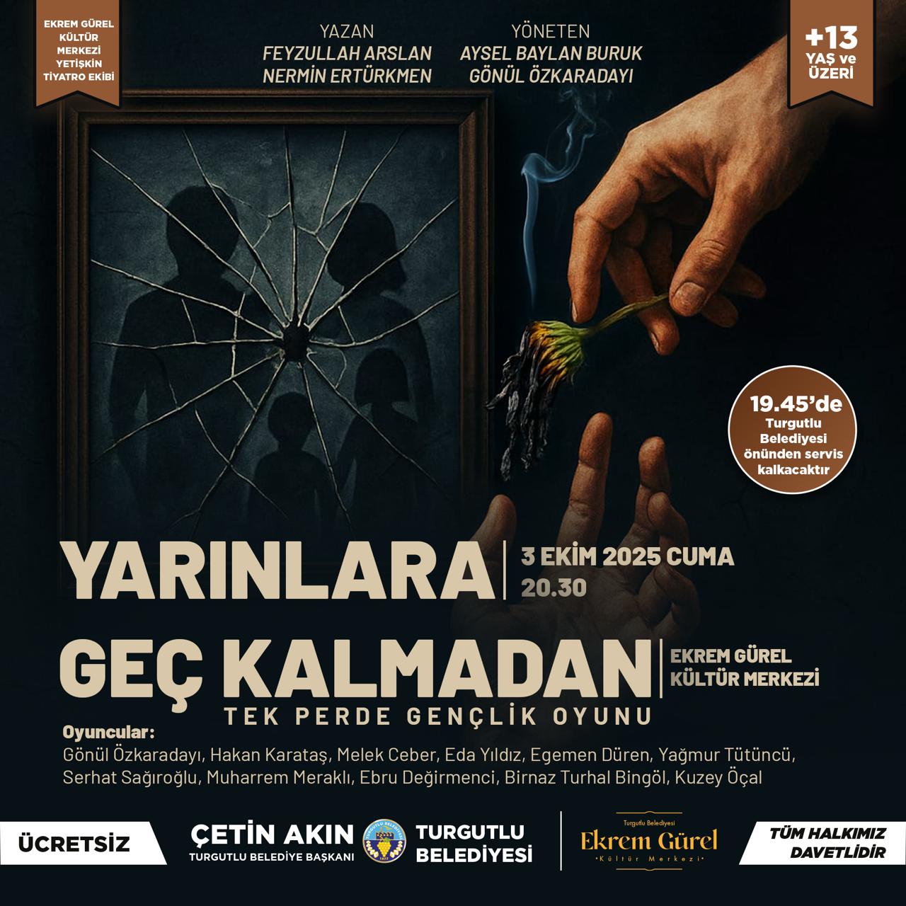Turgutlu Belediyesi, kültür ve sanat alanındaki yatırımlarını taçlandırdığı Ekrem Gürel Kültür Merkezi ilk kez tiyatro gösterimlerine ev sahipliği yapacak. Sahnelenecek iki ayrı tiyatro gösterimi ile hem yetişkinler hem de çocuklar sanat dolu bir buluşma yaşayacak.Turgutlu Belediyesinin yakın zaman içerisinde hizmete açtığı Ekrem Gürel Kültür Merkezi, ilk kez tiyatro oyunlarına ev sahipliği yapmaya hazırlanıyor. Kültür ve Sosyal İşler Müdürlüğü bünyesinde faaliyet gösteren Ekrem Gürel Kültür Merkezi tiyatro ekipleri, hem yetişkinlere hem de çocuklara özel hazırlanan oyunlarla sahne alacak. 3 Ekim Cuma günü saat 20.30’da Ekrem Gürel Kültür Merkezinde sahnelenecek olan “Yarınlara Geç Kalmadan” isimli tek perdelik gençlik oyunu, toplumsal sorunlara dikkat çekerek güçlü bir mesaj verecek. Oyunu izlemek isteyen vatandaşlar için saat 19.45’te Turgutlu Belediyesi Hizmet Binası önünden ücretsiz servis kaldırılacak ve oyunda 13 yaş sınırı olacak. 4 Ekim Cumartesi günü saat 17.00’de ise çocuklar için özel olarak hazırlanan “Şeftali Sokağı Hayvanları” Ekrem Gürel Kültür Merkezinde izleyiciyle buluşacak. Hayvan ve doğa sevgisini eğlenceli bir kurguyla sahneye taşıyan oyun için de saat 16.15’te Turgutlu Belediyesi Hizmet Binası önünden ücretsiz servis hizmeti verilecek.“Merkezimiz, Turgutlu’da kültür ve sanatın yeni adresi”Turgutlu Belediye Başkan Yardımcısı Hüseyin Maliz, “Hemşehrilerimiz tarafından oldukça ilgi gören tiyatro etkinliklerimize kısa bir süre önce hizmete açtığımız Ekrem Gürel Kültür Merkezimizde devam ediyoruz. Merkezimiz, artık Turgutlu’da kültür ve sanatın yeni adresi. Tiyatro ekiplerimizin büyük bir heyecanla hazırladığı programla hem çocuklarımız hem de yetişkinler kaliteli bir vakit geçirecekler. Her zamanki gibi çok keyif alacağımız, çok beğeneceğimiz tiyatro oyunlarına tüm halkımızı bekliyoruz” şeklinde konuştu.