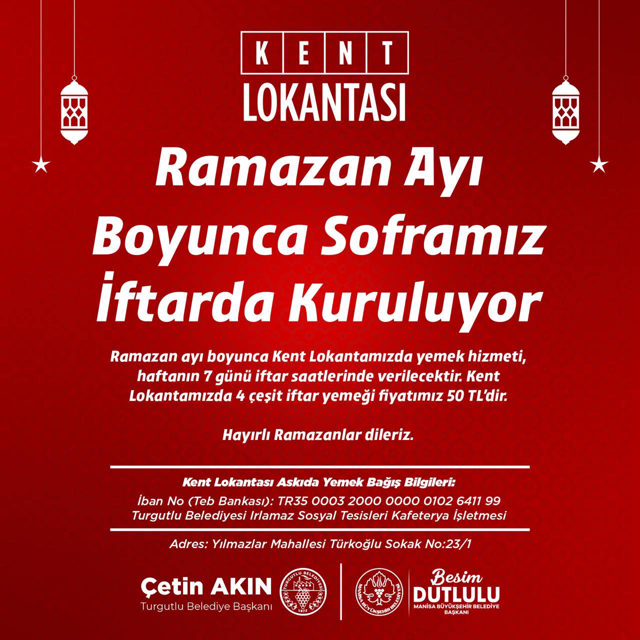 Turgutlu Belediyesi ve Manisa Büyükşehir Belediyesi iş birliğiyle kentte hizmet veren Kent Lokantası, Ramazan ayı boyunca iftar saatinde açık olacak.Turgutlu Belediyesi ile Manisa Büyükşehir Belediyesinin sosyal belediyecilik anlayışı doğrultusunda hayata geçirdiği Kent Lokantası’nda, Ramazan ayı süresince haftanın 7 günü iftar saatinde uygun fiyatlı ve sağlıklı menüler vatandaşlarla buluşturulacak. Söz konusu bu uygulamayla özellikle dar gelirli vatandaşların iftarlarını rahatlıkla yapabilmesi amaçlanıyor. Konuyla ilgili açıklamada bulunan Turgutlu Belediye Başkanı Çetin Akın, “Dayanışma ve paylaşma ayı olan Ramazan ayında sofralarımızı hep birlikte büyütmeyi amaçlıyoruz. Bu doğrultuda haftanın 5 günü, öğle saatlerinde hizmet verdiğimiz Kent Lokantamız Ramazan boyunca haftanın 7 günü iftar saatinde hemşehrilerimizin hizmetinde olacak. Bu vesileyle Kent Lokantamızda aynı sofra etrafında buluşabileceğiz” dedi.