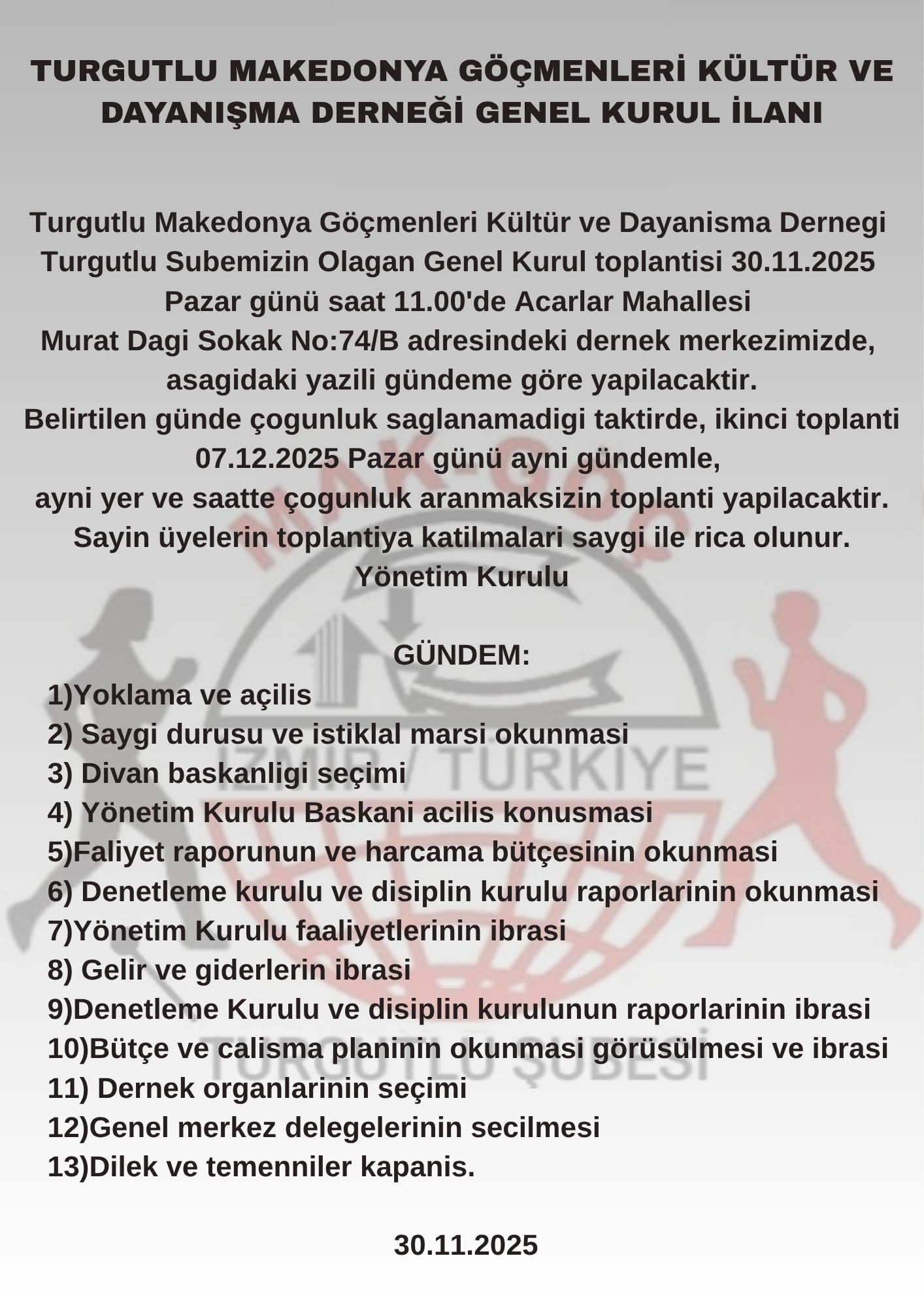 Manisa’nın Turgutlu ilçesinde faaliyet gösteren Turgutlu Makedonya Göçmenleri Kültür ve Dayanışma Derneği, Olağan Genel Kurul’a gidiyor. Dernek üyeleri, 7 Aralık Pazar günü yapılacak seçimde sandık başına geçerek yeni yönetimi belirleyecek.Genel kurul toplantısı, saat 11.00’de Acarlar Mahallesi Muratdağı Sokak’ta dernek merkezinde gerçekleştirilecek. Katılımın yoğun olması beklenirken, dernek yetkilileri tüm üyelere çağrıda bulunarak seçim sürecinin birlik ve beraberlik içinde geçmesini temenni etti.Turgutlu Makedonya Göçmenleri Kültür ve Dayanışma Derneği, yıllardır ilçede sosyal dayanışma, kültürel etkinlikler ve göçmen hemşehriler arasında bağları güçlendirmeye yönelik çalışmalar yürütüyor. Genel kurulun ardından yeni yönetimin kısa sürede göreve başlaması bekleniyor.